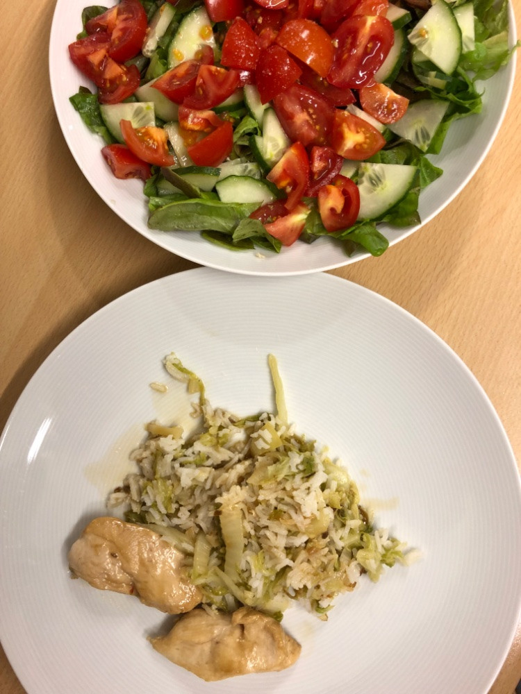 Heute gab es Reis mit Chinakohl und in Sojasoße+Süß-sauer Soße gedünsteten Hühnerbrust. Dazu Salat.