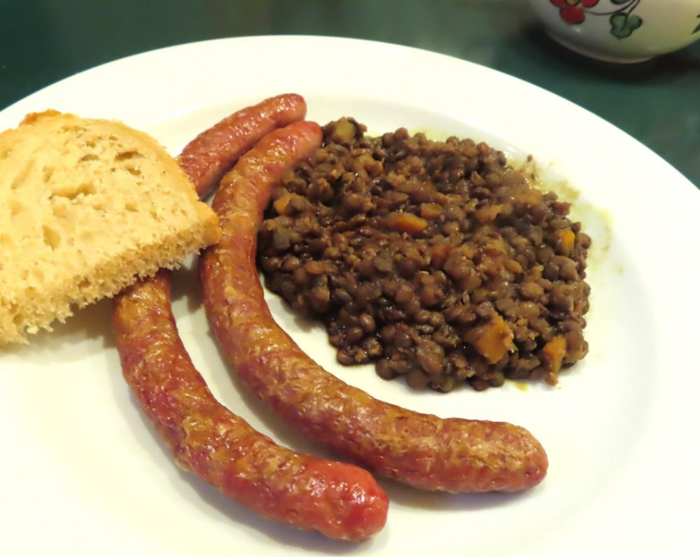 Hier gab es Wildbratwürschtl mit Berglinsen (obenauf Kürbiskernöl) und Endivienradicciosalat.