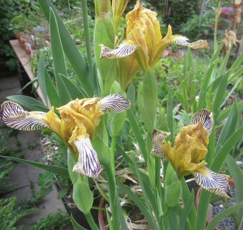 Auch das habe ich als Iris variegata bekommen, darüber wie reinrassig sie ist nachzudenken ist mir zu hoch ;D, die Domblätter sind nicht weggefressen, sondern sind einfach so. Sicher nicht die schönste Iris, dafür sieht sie aber wie ein Pflanze gewordener Brueghel aus.
