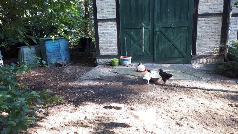 In der ersten Urlaubswoche (nicht meine) holte ein Habicht ein Junghuhn (ein HÄhnchen 8)), und die Entscheidung fiel - alle Hühner in den alten Bereich, der hat mehr Bäume und ist geschützter, weil sonst der Habicht wieder kommt.