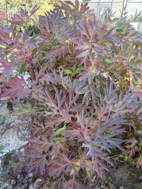 Nichtsdestotrotz (der geringeren Winterhärte) sind die Strauchpaeonien mit P.delavayi-Blut meine absoluten Favoriten.Hier mal die Delavayi (Form Colwal) in Herbstfärbung. Diesen lilablaumetallic-Ton hat sonst keine Strauchpaeonie bei mir. (Foto aus 2011)