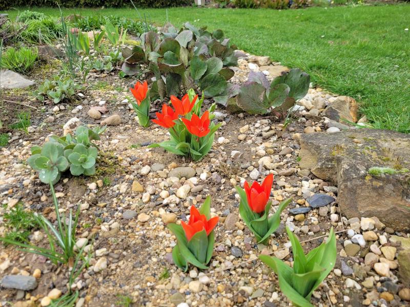 Hier halten sich Tulpen ja gar nicht gut im Lehmboden. Die kleine 'Füsilier' hatte ich während der 3 Trockensommer problemlos im Steppenbeet und dann verschwanden sie mehr oder weniger im letzten Regenwinter. Im Herbst hatte ich deshalb ein paar dort im Schotterrand nachgepflanzt, die mir nun immerhin viel Freude bereiten. Das Rot so grell, daß die Kamera streikt... ;D