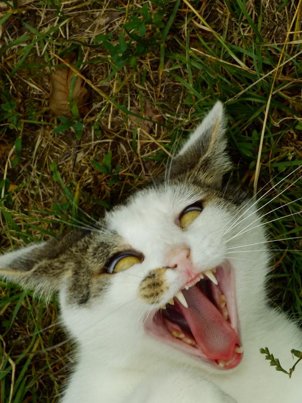 Das Bild erinnert mich an den Biss vor ein paar Wochen. Kater Strolchi hatte auch gegähnt und mir seine Reißzähne gezeigt, bevor er sie an meinem Fuß ausprobierte. >:(