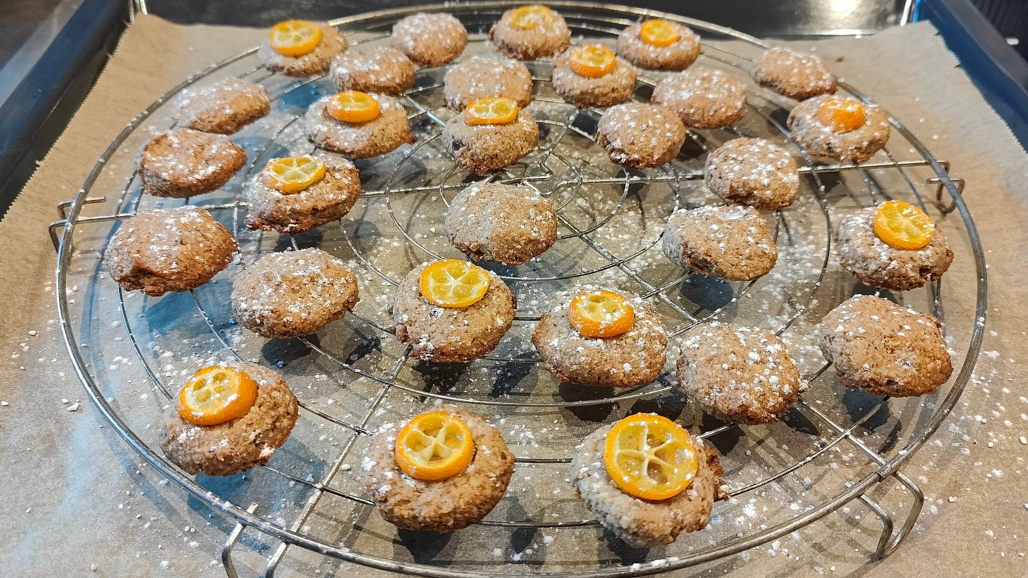 Die Maronenplätzchen sind lecker geworden. Im Rezept waren Kumquatsscheiben drauf, mir schmecken sie ohne besser. Morgen probier ich dann Nina´s Ricciarelli