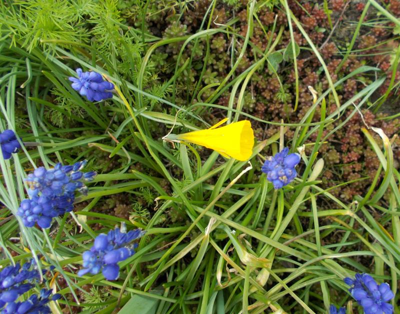 Hier blüht jetzt doch noch die ganz winzige (Blüte daumennagelgroß) Narcissus willkommii gerade auf. Ich bin gespannt, ob sich der Horst bestockt und mit den Jahren üppiger wird (wenn er sich überhaupt hier hält).
