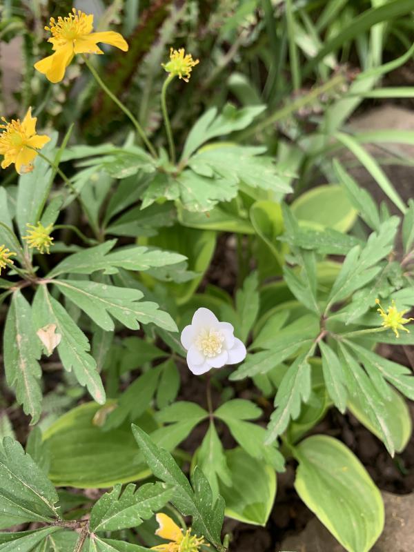 Zwischen meinen verblühten gelben Buschwindröschen, die vom Bach in den Garten gewandert sind, taucht nun plötzlich eine weiße Anemone auf, die wohl kaum wild sein wird. Da ich außer Blue Eyes sonst keine weißen habe, frage ich mich, welche Sorte das ist, und woher sie kommt…