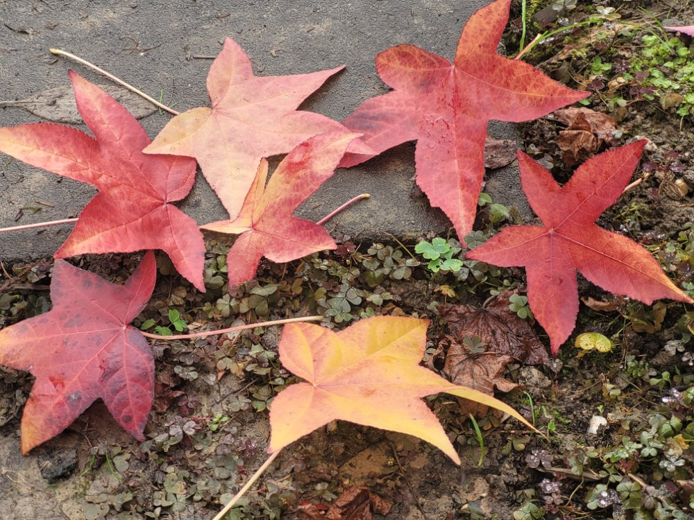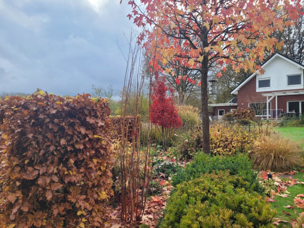 Auf so einen sonnigen Moment warte ich auch schon seit Wochen, aber die Zeitspanne, in der im November die Sonne schien, lässt sich in Minuten messen... Ungewöhnlichen Ansichten aus Deinem Garten, da kann auch der "Rücken entzücken". ;) Das rote Amberbaumlaub zwischen den immergrünen Stauden ist ausgesprochen malerisch! Was ist das für ein kleines Sträuchlein im Vordergrund am Plattenweg zwischen Amberbaum und Ahorn?