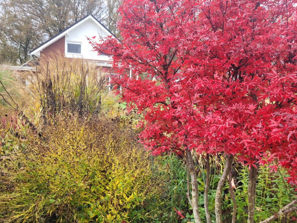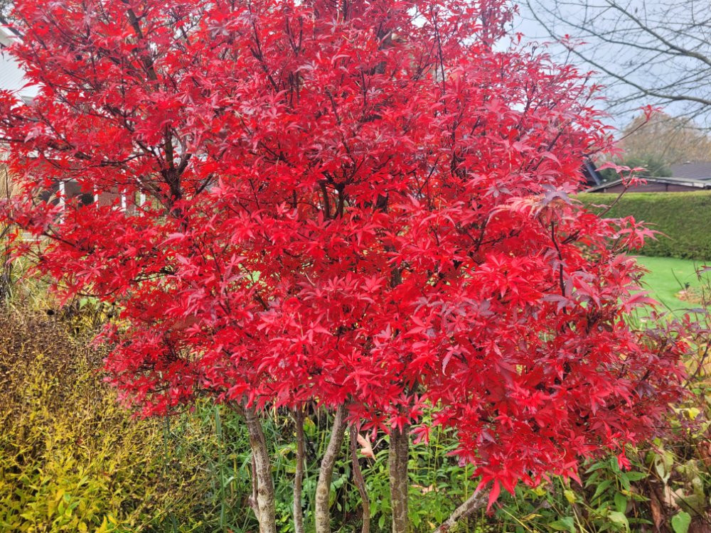 Acer 'Skeeter's Broom ' zeigt sich spät in diesem Jahr in feurigen Rot. Vielleicht, weil er nach dem Totalverlust wegen Frostschaden vom Frühjahr erst im Juni wieder neue Blätter gerieben hatte? :-*