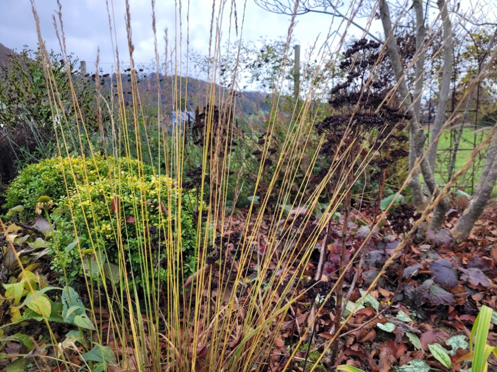 Überhaupt sind die Gräser nun wichtige Strukturgeber... wie hier Molinia 'Carmarthen' unter dem Cornus.