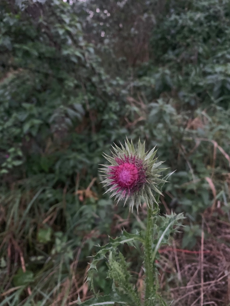 Eine nickende Distel und nesselblättrige Glockenblume am Wegesrand