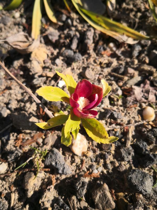 Ein Blütenstängel dieses reichblühenden Sämlings windet sich bodennah und diese Blüte schaut mich an.