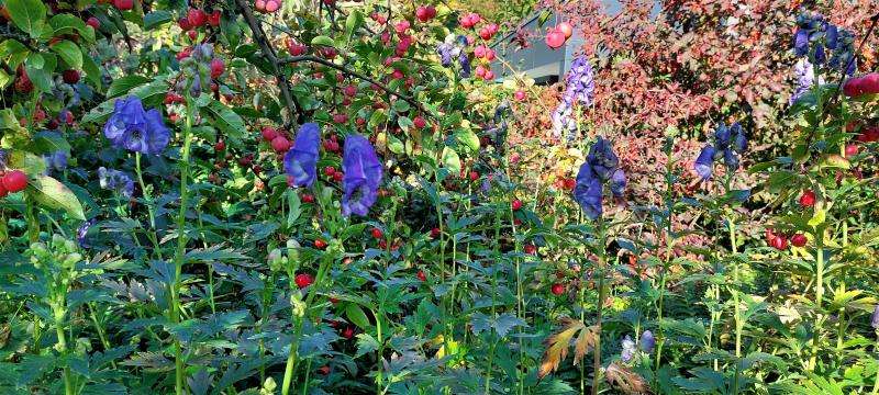 Genau: Im Herbst ist das Eisenhutblau unverzichtbar bei all den Gelb-, Orange- und Rottönen. Ich habe mal durchgezählt: Aktuell sind es ca. 70 Blütenstängel im ganzen Garten. Seit 35 Jahren sind sie vorhanden und die drei Kinder und sieben Enkel haben sich bis jetzt noch nie "vergriffen", weil alle um die Giftigkeit wissen.