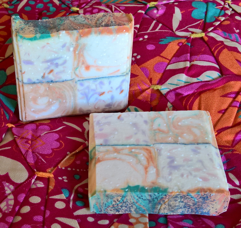 Eine Themenseife, Marble und Konfetti waren die Vorgaben. Für die Konfettiteile habe ich ein Stück von meiner Bontje geraspelt, hatte nicht so viele bunte Reste. So richtig kommt der Marbleswirl auf dem kleinen Raum nicht zur Geltung. Trotzdem gefällt sie mir sehr. Bei uns im Norden heißt der Karneval – Fasching. Ich mag weder das eine noch das andere ;-) Dies Seifchen allerdings schon. Irgendwie hat sie dann gleich zweierlei Konfetti, da hat sich entweder die Maisstärke (für mehr Schaum) oder das Tiox nicht ordentlich aufgelöst.