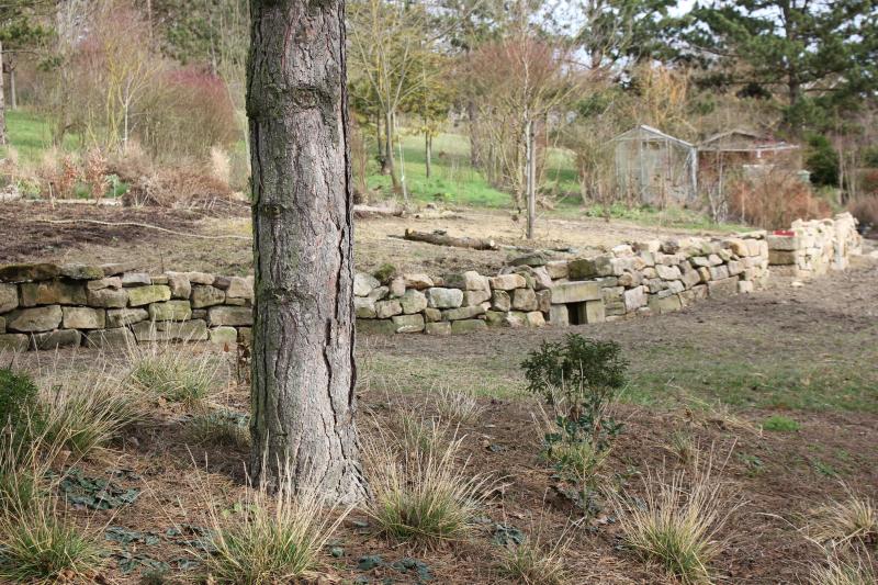 Derzeit läuft bei uns ein Trockenmauerbau. Er soll das Sonnenbeet nach unten abschließen. Ich bin allerdings nur mit altklugen Verbesserungshinweisen beteiligt, die Arbeit macht GG. Das ist der derzeitige Stand: