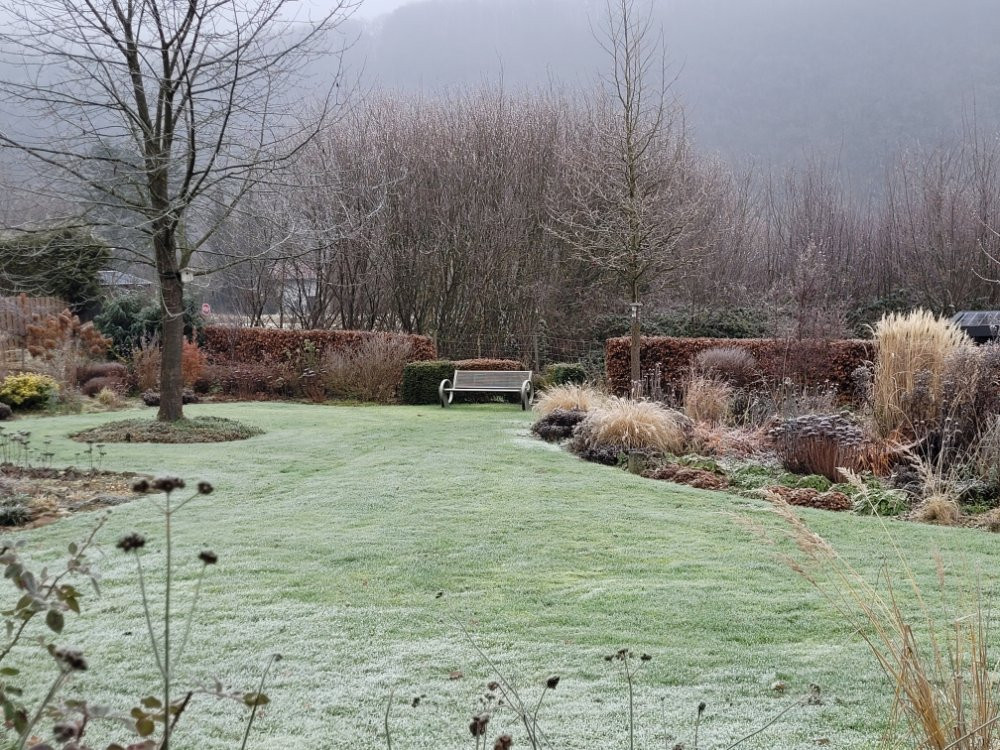 Wir sind nach den Weihnachstagen nun wieder zuhause und ich habe trotz ungemütlicher Kälte mit tief liegenden Nebel schnell noch etwas Frostschutz über meinem Topfquartier verteilt.