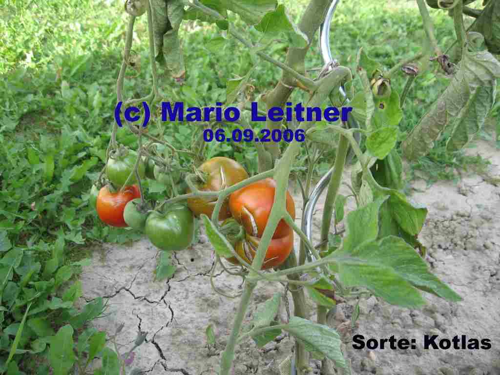 Hier die Vorstellung meiner Sorte "Kotlas".Rote Runde Früchte mit einem Durchmesser von 3,5 bis 5 cm und einem Gewicht von ca. 20 bis 50 g. Pflanzen ca. 1,5 m hoch. Kartoffelblättrig. Erntebeginn Mitte Juli.Bei Vollreife und schönem Wetter guter Geschmack, sonst wässrig. Mittlerer Ertrag.Was habt Ihr für Erfahrungen mit der Sorte ?