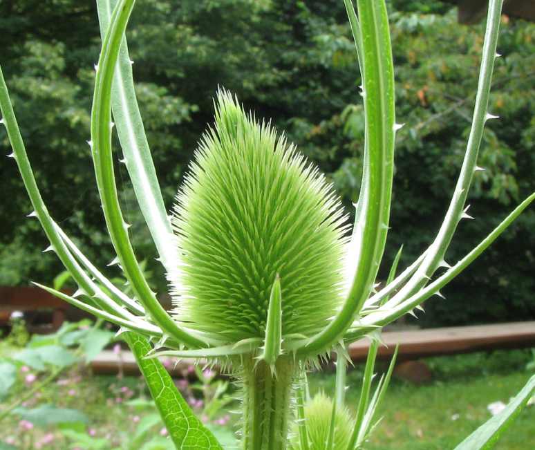 Wilde Karde Dipsacus silvesterDer Name Dipsacus kommt aus dem griechischen "dipsa" = Durst: Nach Regen sammelt sich in den Trichtern der Stengelblätter das Wasser, das Vögeln u.a. zum Durststillen dienen kann.Die Pflanze ist in wärmeren Gebieten insbesondere auf Überschwemmungsflächen, an Ufern, Wegen, auf Weiden und in Ruinen sowohl in den Niederungen als auch im Hügelland zwischen Juli und Oktober anzutreffen.Ich werde in einer Woche nochmals nachsehen, ob sie erblüht ist.Übrigens: Der Saft der Karde-Wurzel gilt als wirksames natürliches Mittel gegen Borreliose.