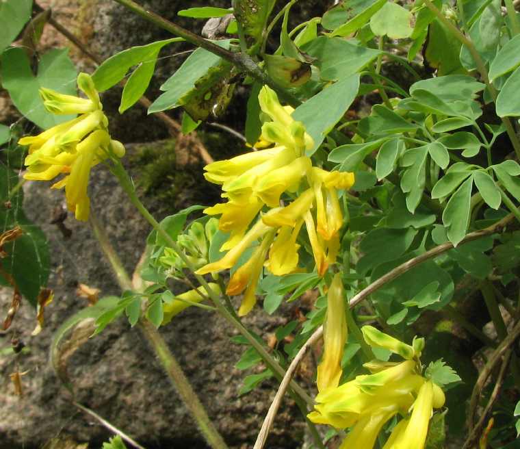Gelber Lerchenspron Pseudofumaria luteaLiebt kalkhaltige, sickerfrische Böden, auch Mauerspalten, Ruinen und Säume. Aus S-EU stammende Zierpflanze, in D in wintermilden Gebieten verwildert.
