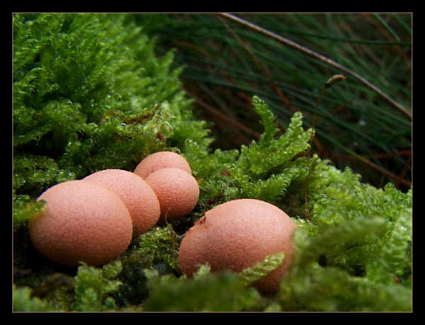 Hier mal richtige rosa Knallbonbons, Blutmilchpilze (Lycogala epidendrum), die sind so knallig, dass ich ihnen einen Rahmen spendiert habe.