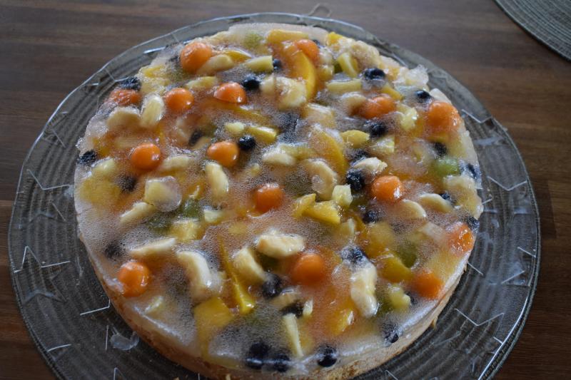 Obstkuchen mit Ananas, Banane, Heidelbeeren, Mango, Pfirsich, Physalis und Trauben.