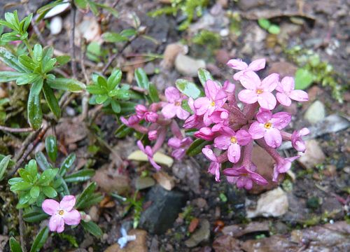 Daphne cneorum var. pygmaea, eine besonders niederliegende und deutlich zartere Variante von D. cneorum.