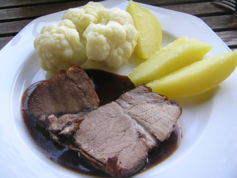 wir hatten schweinebraten mit einer balsamico-biersoße, dazu salzkartoffeln und blumenkohl