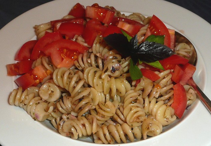 Gestern Nudeln mit Pesto von Walnüssen, Walnussöl und zweierlei Baslikum und der letzten im Freiland gereiften 'Roten Zora'.