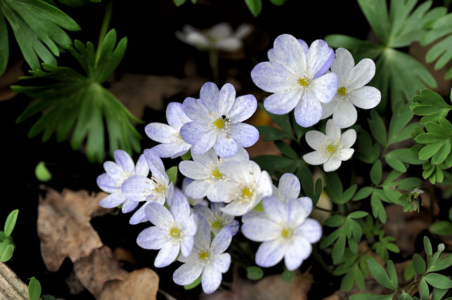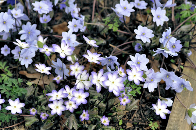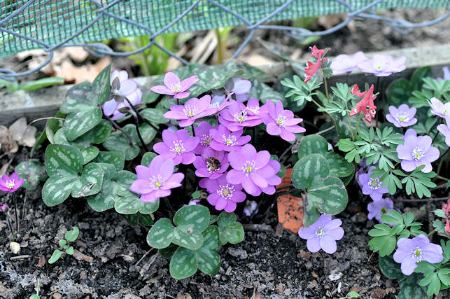 marmorierte blätter zeigen hepatica nobilis u.a. aus südtirol. es gibt aber noch andere herkünfte (var. pyrenaicum) mit noch ausgeprägterer blattzeichnung.