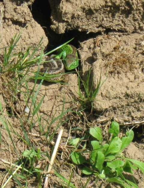 Weiß jemand etwas über die Wohngewohnheiten von Zauneidechsen? Mein Eindruck ist, dass hinter dem Stein, auf dem das Männchen gerade sitzt, die weibliche Eidechse zu Hause ist. Sie ist jedenfalls dort meist zu sehen. Ihn sehe ich erst, seit die Paarungszeit begonnen hat. Er kommt von jenseits des Hauses, bleibt eine Weile bei ihr und verschwindet dann wieder, immer auf Deckung bedacht, ums Haus herum auf die andere Seite. (Dort habe ich auch schon ein Weibchen beobachtet - wechselt er von einer zur anderen?)