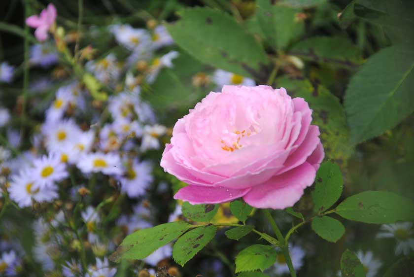 bei mir blüht Mrs.John Laing mit Kalimeris 'Blue Star'
