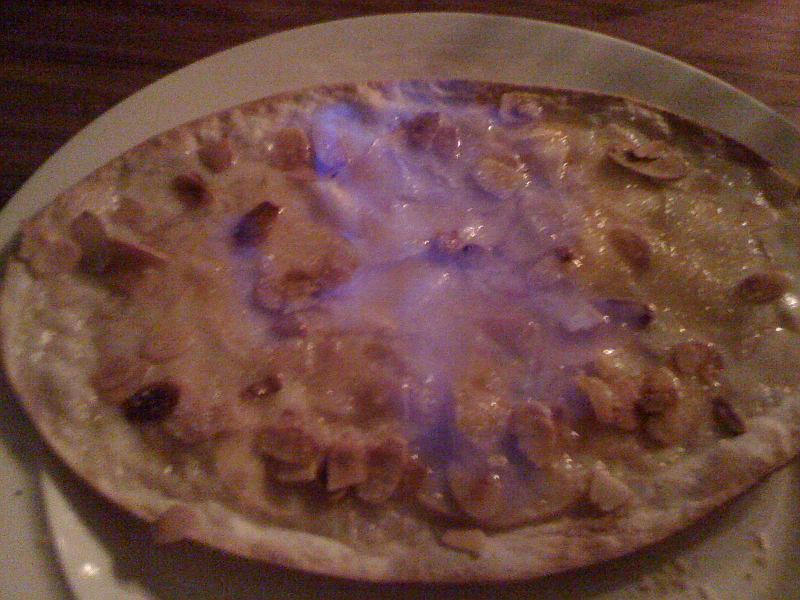 und zum abschluss flammkuchen süß mit apfel und mandelblättern, calvados-flambiert!