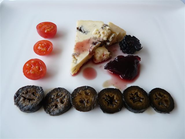 es gab Blue Stilton mit Portwein getränkt, dazu etwas Rotweingelée, eingelegte grünen Walnüssen und ein Kartoffelbrötchen mit Walnusskerne.