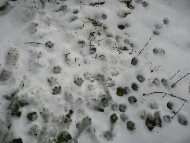 Heute sah ich, dass der vorletzte Tontopf nun auch verschwunden ist. Der letzte hängt noch in einem Apfelbaum, rund um den Topf sind Zweige frisch abgebrochen und unter dem Topf gibt es jedermenge Spuren. Am meisten irritiert haben mich die Spuren, bei denen die zwei äußeren Zehen fast waagerecht zueinander stehen. Nach Waschbär sieht das jedenfalls nicht aus (Gott sei Dank). Die Fährte, die auf den Baum zuläuft, liegt nicht so auf einer Schnur, wie es eine Fuchsfährte sollte. Ich habe eben noch mal länger Bilder von Fährten verglichen, aber nichts will so recht passen. Fällt Euch noch was ein dazu?Ich hatte zehn Tontöpfe aufgehängt, gefüllt mit Sonnenblumenkernen, Walnüssen, Hanf, Mohn und Kokosfett. Von zehn Töpfen sind acht spurlos verschwunden. Da sie ja einiges wiegen, frage ich mich, wer das gewesen sein könnte. Der Schnee unter den Bäumen, in denen sie hingen, ist unberührt (allerdings schneit es auch seit Freitag so ziemlich ununterbrochen). Habt Ihr eine Idee?