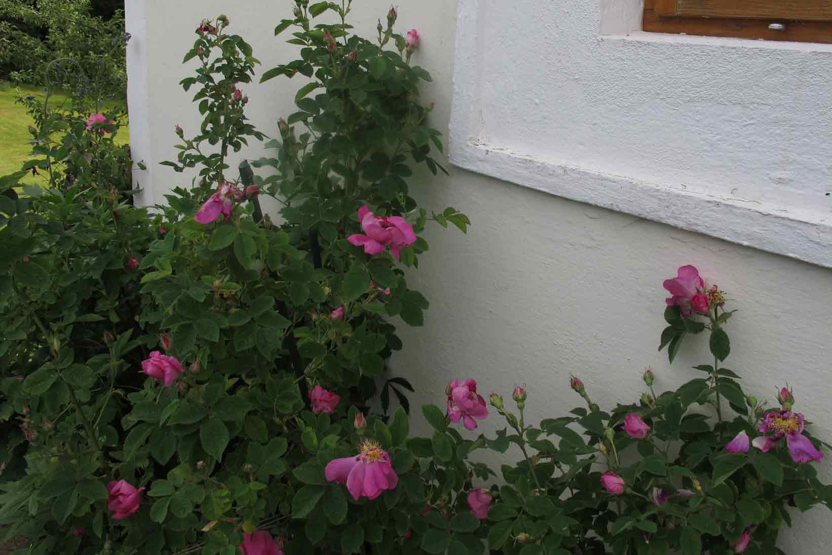 Eigentlich hatte ich mich heuer ganz entspannt auf einen rosenlosen Sommer eingestellt, aber dann ist es doch anders gekommen. Als bei den meisten von euch schon die ersten Rosen blühten, fingen sie bei mir erst zögerlich an auszutreiben, manche sahen zum Fürchten aus, und die Nacht zum 18. Mai brachte noch einmal einen argen Rückschlag. Die neuen Triebe meiner Rugosahecke z.B., die ich auf ca. 1/2 m geschnitten hatte, waren allesamt braun, also mußte ich sie komplett runterschneiden. Inzwischen ist sie wieder auf 1,20 m und blüht so üppig wie noch nie. Offensichtlich kann man Rugosas gar nicht genug schneiden. Die schlauen Gallicas haben sich wie immer am längsten Zeit gelassen und dann schier unglaublich geblüht, dafür haben die weißen Albas ausgelassen. Aber der Reihe nach. Den Anfang machten Lisls Finninen und meine Fundfrancofourtana, unberührt von den Unwägbarkeiten der Witterung und grün bis in die Spitzen.So Onni, im Frühjahr 2011 als kleiner Ausläufer gepflanzt und inzwischen ein Riesenbusch von 1,50 x 1,50 m: