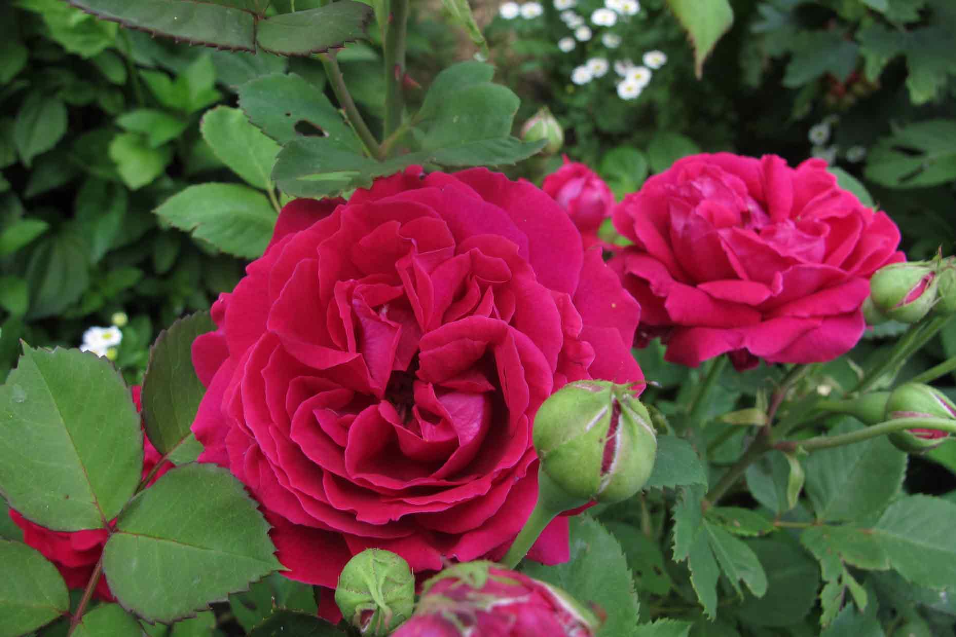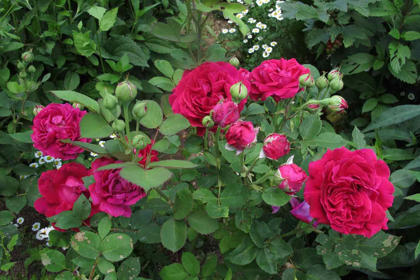 Um im Gemüsegarten zu bleiben: Der Star war Alfred Colomb. Verbrachte den Winter im dicken Reisigmantel und mußte nur auf ca. 40 cm geschnitten werden. Hatte gezählte 48 Knospen, die sich kontinuierlich von Anfang Juli bis in die dritte Augustwoche hinein öffneten. Das Feuer des Rots ist leider nicht einzufangen: