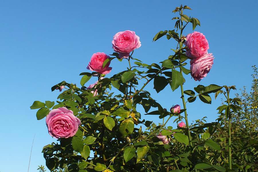 Mirandy, seit 4 Jahren am Standort, eine Mickerei sondergleichen. Jetzt hat sie das erste Mal zwei Stängel und sogar 3 Blüten. Die ersten zwei Jahre gabs kaum Wachstum, keine Blüte, letztes Jahr das Blütenjahr hindurch zweimal eine Blüte, wobei die erste ein Riesensalatkopf war.Jetzt sieht es wirklich so aus, als ob sie langsam durchstartet. Als Kontrast steht sie gleich neben Blanche Lafitte.