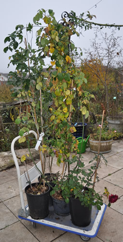 Hier ein paar letzte Woche eingepflanzte Rosen.Nach 2j. Topfhaltung. (Ausgenommen aussen links William S, der ein Neuzugang war).Die Rosen sind um 1,8 m hoch, anstatt 1,2m!
