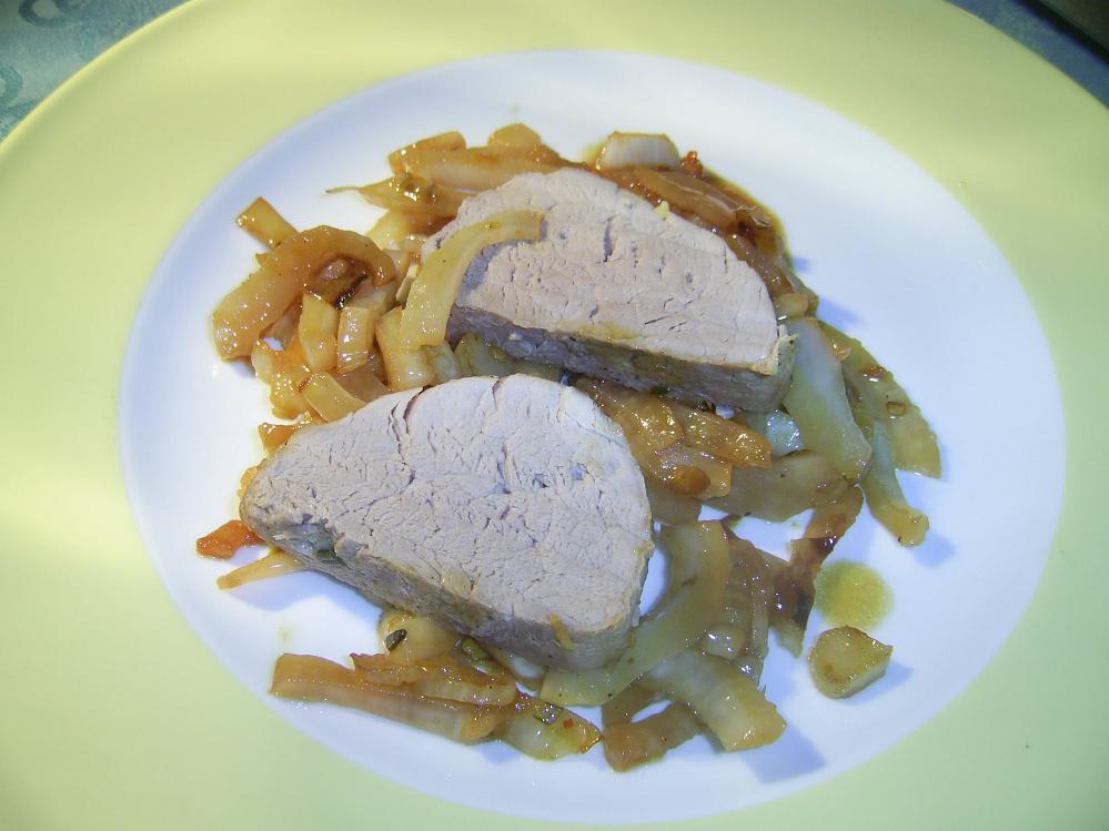 Gestern hatten wir ein im Ofen in Orangensaft geschmortes Schweinefilet mit Fenchel. Die rötliche Farbe des Fenchels ergab sich daraus, dass ich Blutorangensaft verwendet habe.