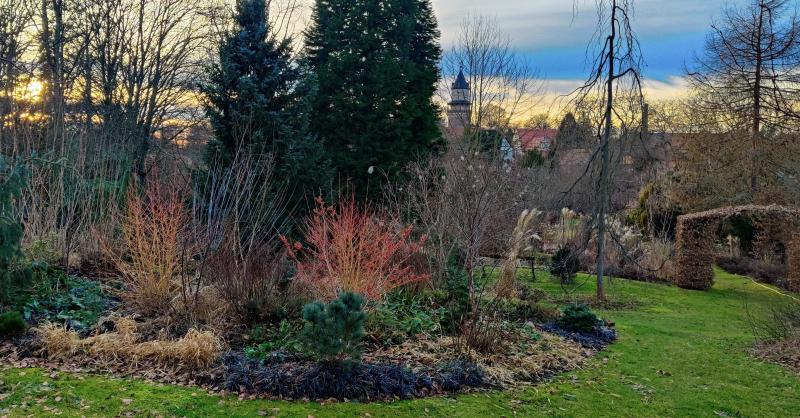 Dieser ist neu gepflanzt und noch ganz klein, seine Aufgabe ist auch die kontrastierende Ergänzung zum Weiß der Rinde des großen Rubus cockburnianus 'Golden Vale' (ziemlich undeutlich im Hintergrund)
