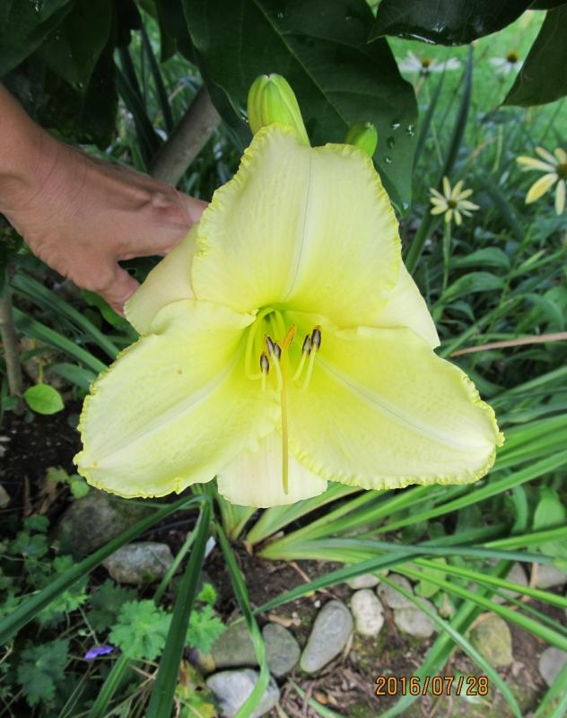 Late Lemonade ist auch ein spät und lange blühendes Kind von Sandra Elizabeth (x Lime Frost), und zeichnet sich durch ein sehr blasses Zitronengelb, guten Duft und sehr hohe Stängel aus. Leider müßte ich im Pool der Nachbarn stehen, um ein ideales Horstfoto aufzunehmen. Blütendurchmesser ca. 14 cm - Höhe 100 cm.