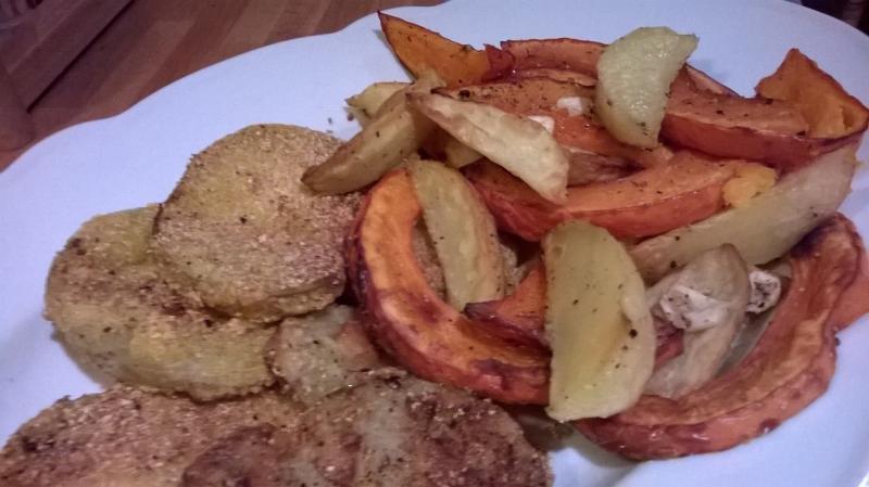 Fried green Tomatoes mit Ofenkürbis und -kartoffeln.