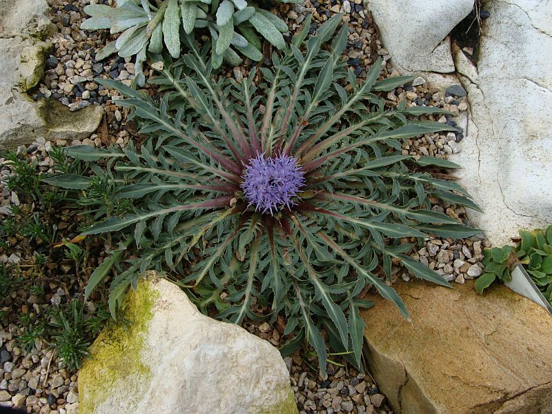 Ich habe 2 Pflanzen unter der Bezeichnung Carduncellus rhaponticoides. Die große blüht jetzt (s. Foto), die kleine , deren Foto ich im nächsten Beitrag bringe, hat völlig andere Blätter. Im Internet finde ich beide Blatttypen, alle unter dem selben Namen. Oder sind das doch 2 verschiedene Arten?