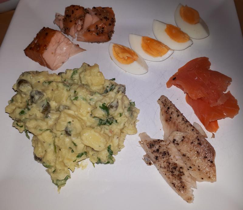 Gestern gab es Kartoffelsalat mit Kapern und frischem Koriander, verschiedenen Räucherfischen, Ei und Gurkensalat.