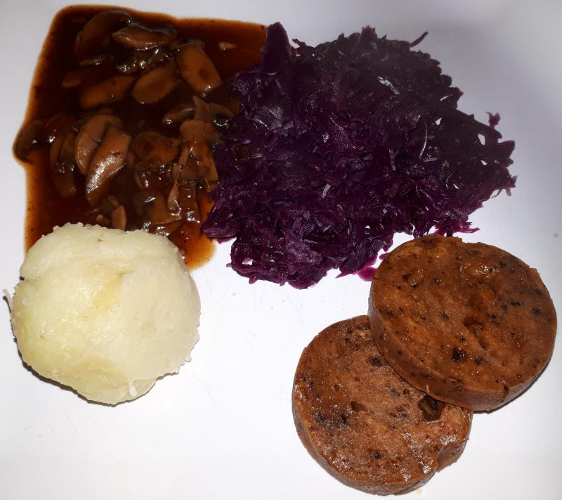 Gerade hatten wir Rotkohl, Klöße, gebratenen Saitan, Dunkelbiersoße mit Champignons und Feldsalat