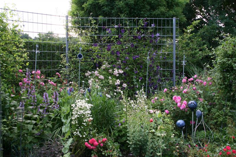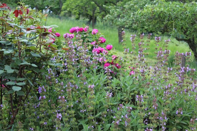 Bei euren gepflegten Gärten getraue ich mich kaum was zu posten. Am Rand von meinem Gemüsebeet habe ich Duftfestival und Rose de Resht gepflanzt, Die Kombination mit gewöhnlichem Gewürzsalbei hat was.