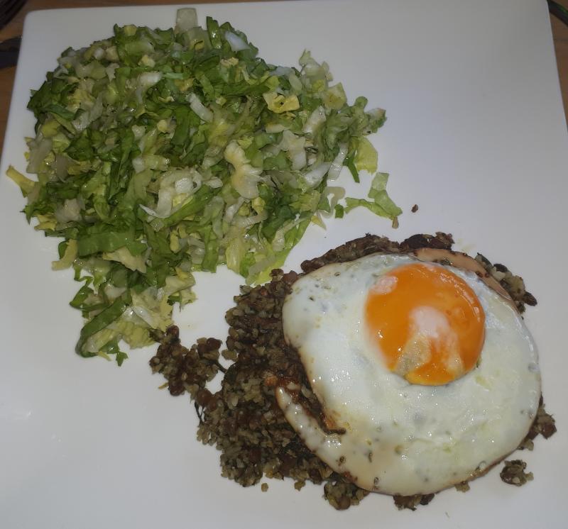 Resteessen: gebratener Reis mit Spinat, Bärlauch, Lauchzwiebeln und Linsen, Spiegelei, Endivien
