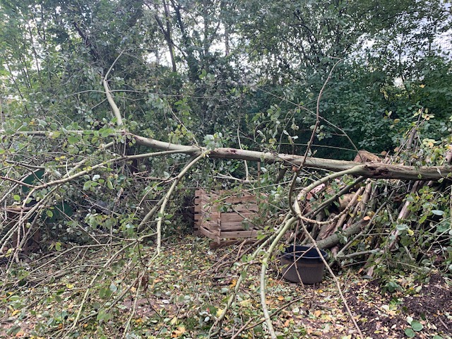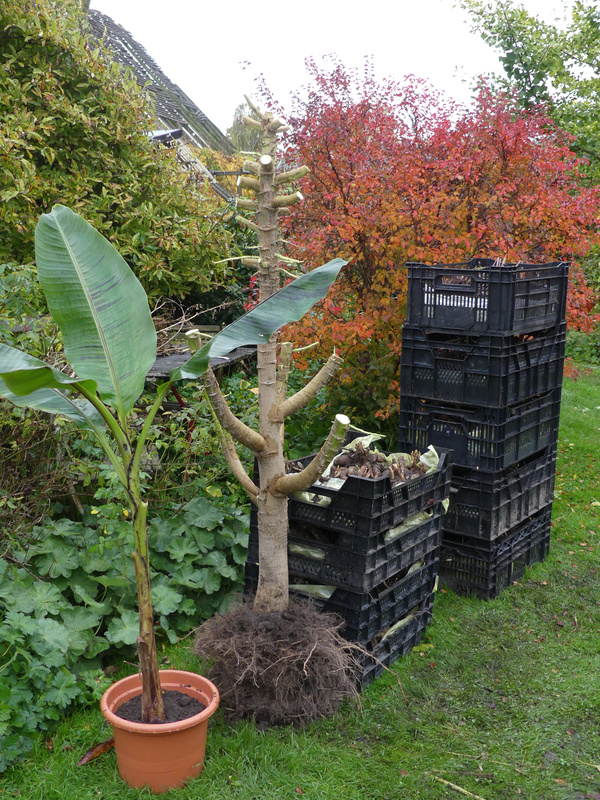 Für die kommende Nacht ist Frost angesagt, also habe ich mich heute auf die Dahlien gestürzt. Nun sind alle draußen, neun Kisten sind voll geworden. Dazu eine Kiste und drei große Mörteleimer mit den ersten Canna. Die zwei Bananen sind in Topf bzw. Mörtelbutte umgezogen, die Baummalve hatte der Sturm schon umgelegt. Ich weiß gar nicht, ob sich bei der die Überwinterung noch lohnt, eigentlich zweijährig ist sie nun schon drei Jahre alt. Zurückgeschnitten stört sie aber auch nicht im Stall, also wird es ein Versuch.