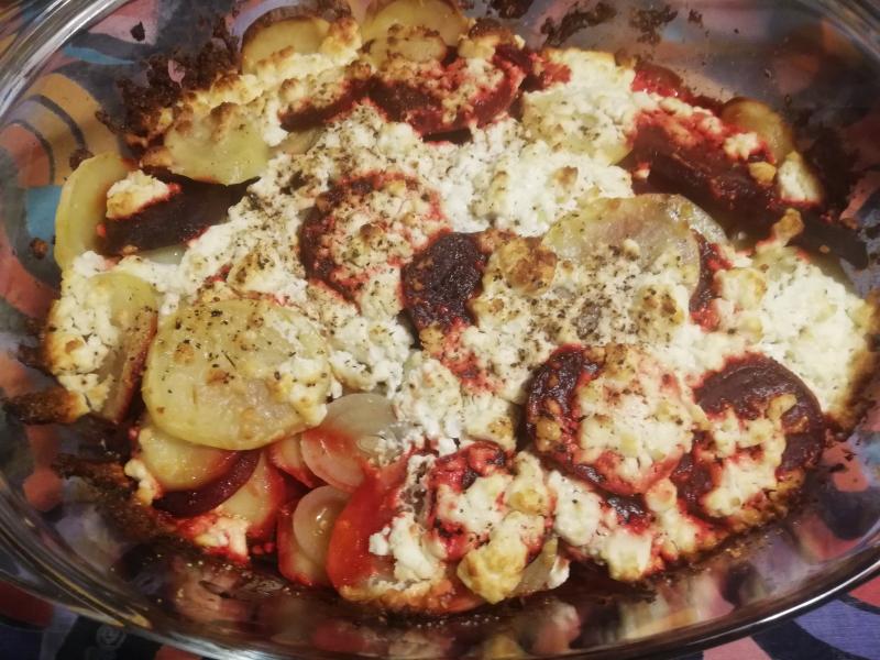Auflauf aus Rote Bete, Zwiebeln, Kartoffeln, Feta gewürzt mit gehacktem Rosmarin, Thymian, Salz und Pfeffer und Olivenöl.