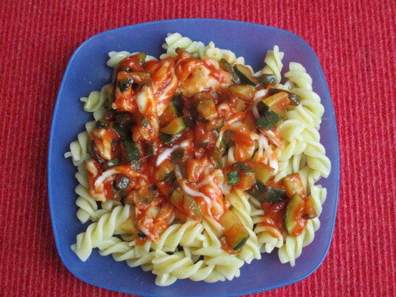 Hier Spirellen mit Zucchini, passierte Tomaten und Zopfkäse.
