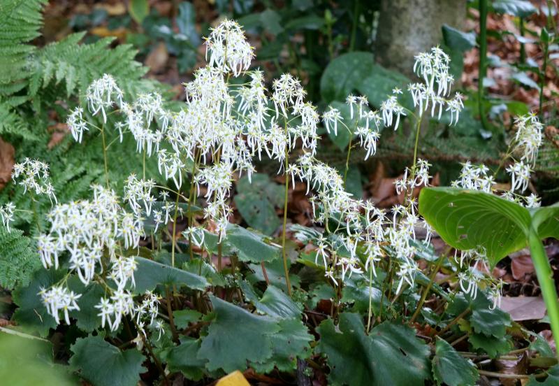 Asternsämlinge blühen auch noch üppig vor dem Herbstlaub des Khakisämlings und Paeonia ´White Innocence´ rechts, die dieses Jahr im Herbst auch ungewöhnlich attraktiv aussieht.